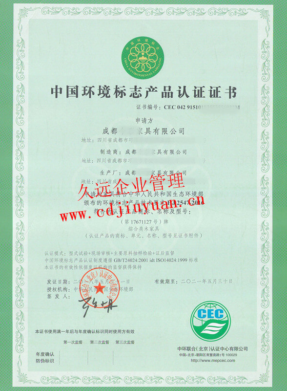 中國環境標志產品認證證書(十環認證)