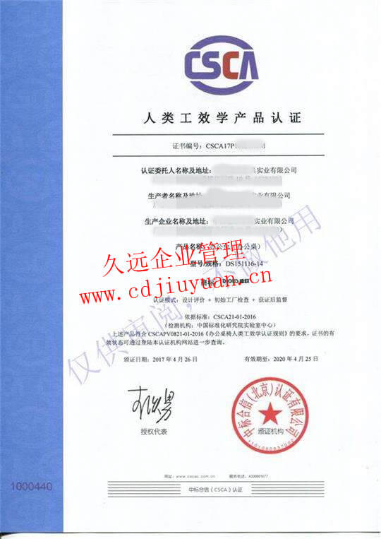 人類工效學產品認證證書