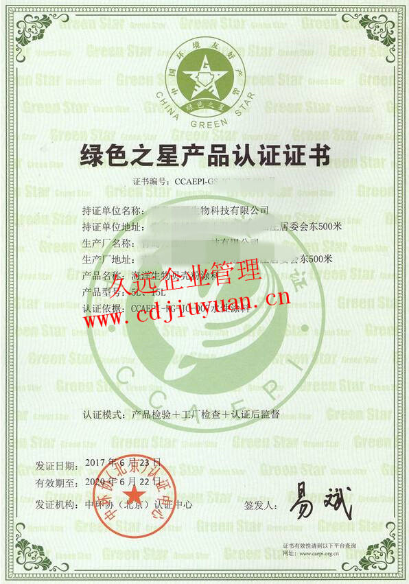 綠色之星產品認證證書