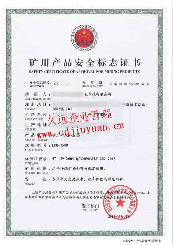 礦用產品安全標志認證證書